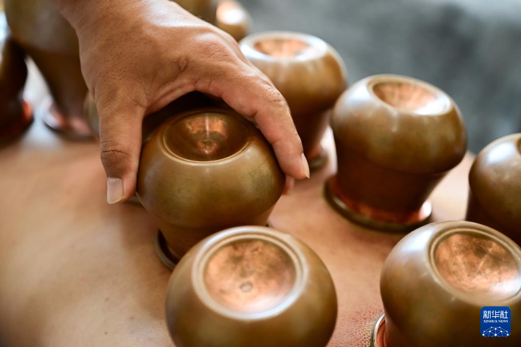 8月27日,游客在位于黄山市屯溪区的新安养生馆体验拔罐。