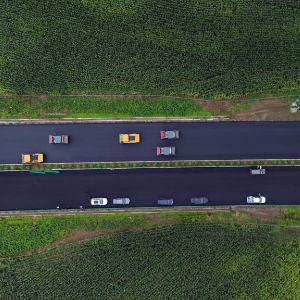 8月28日,在铁科高速公路延寿县至尚志界段主线,大型机械设备在进行沥青摊铺收尾作业(无人机照片)。