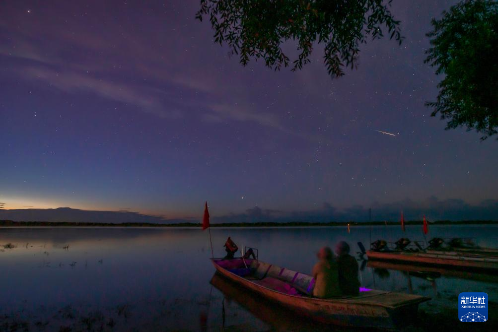 在黑龙江省伊春市嘉荫县黑龙江畔,一对夫妇在仰望星空(8月14日摄)。