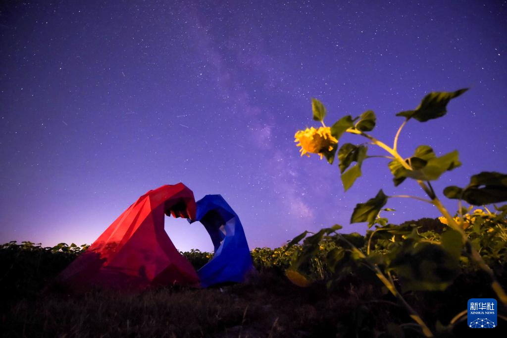 在黑龙江省佳木斯富锦市锦山镇,一对情侣在观赏银河和两侧的牛郎星、织女星(8月24日摄)。