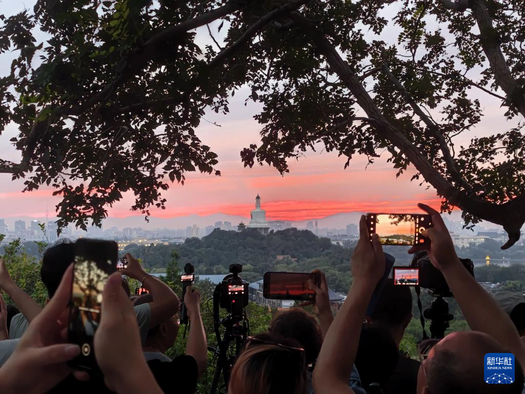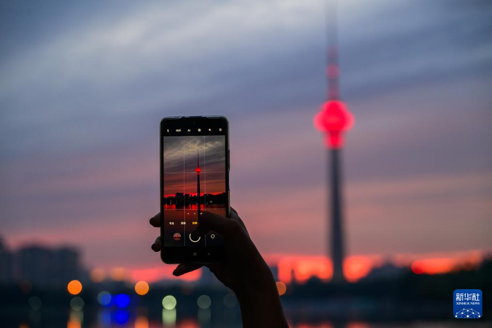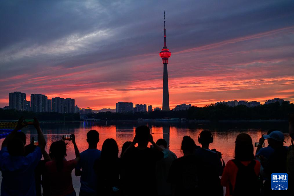 8月29日,市民游客在北京玉渊潭公园拍摄晚霞。