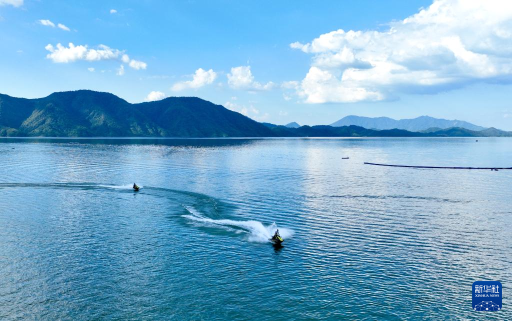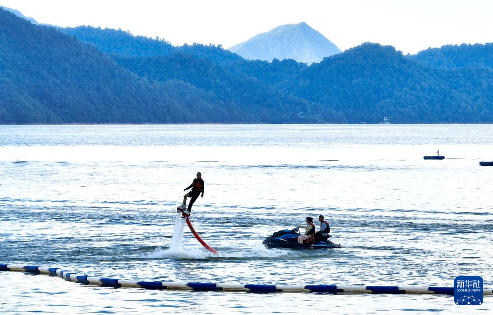 8月28日,游客在黄山市黄山区太平湖水上运动中心体验水上项目。