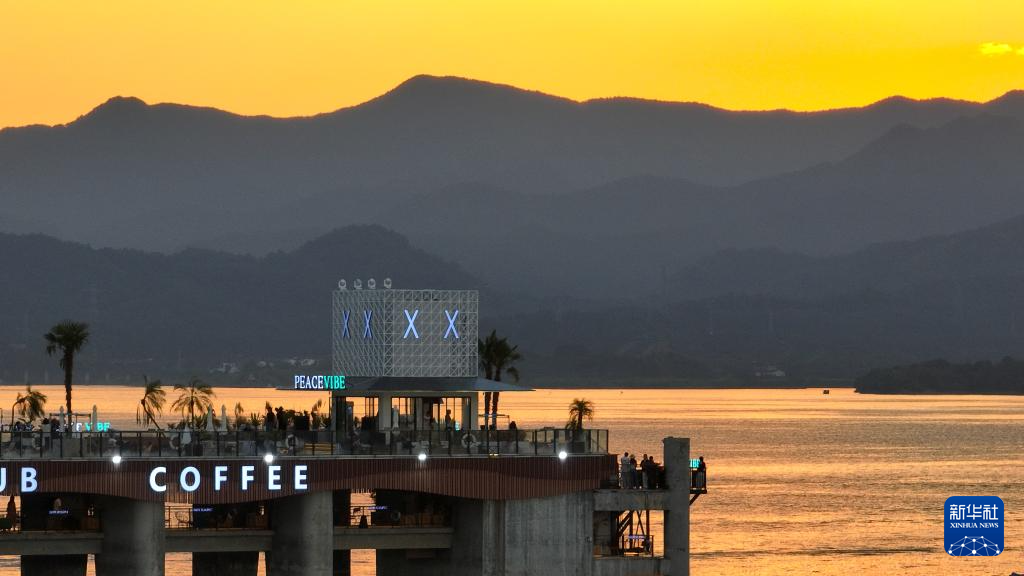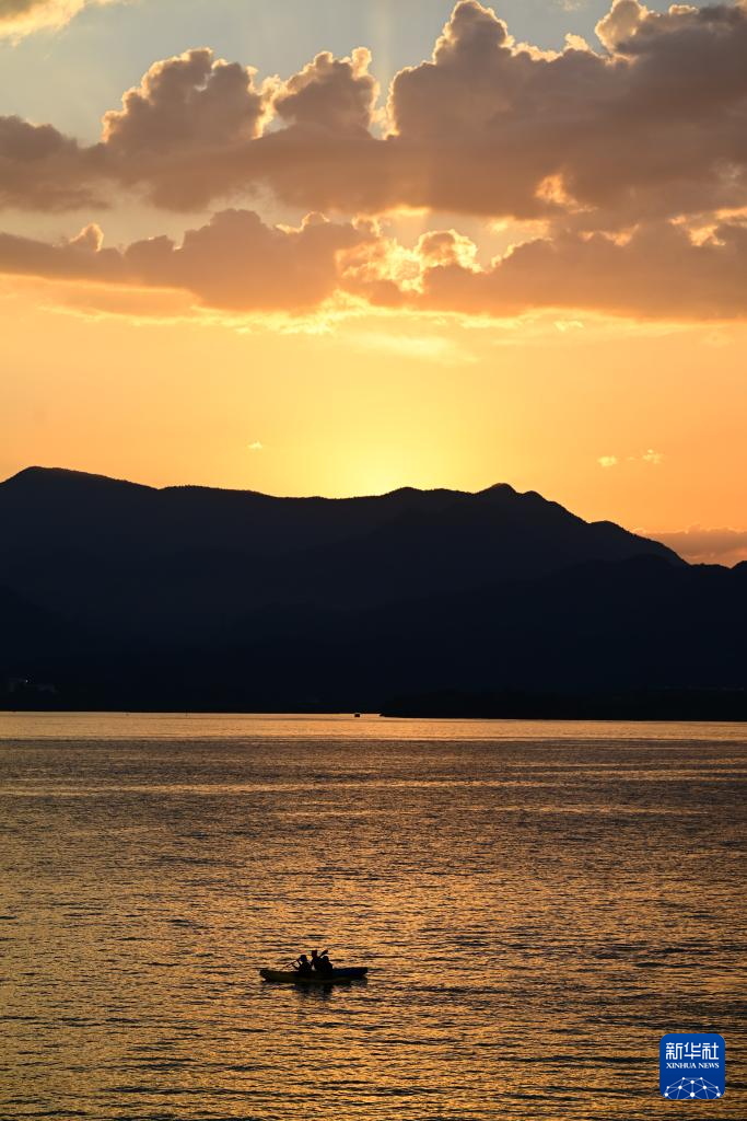 8月28日,游客在黄山市黄山区太平湖一处亲水平台观赏落日(无人机照片)。