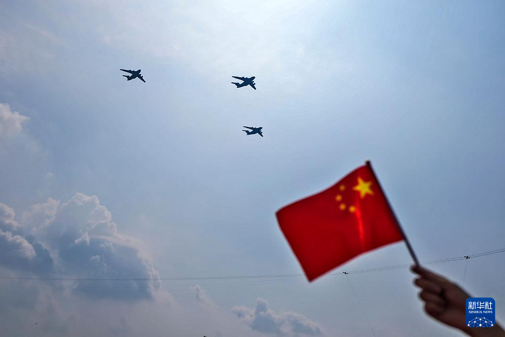 9月3日,纪念中国人民抗日战争暨世界反法西斯战争胜利80周年大会在北京隆重举行。这是观众拍摄空中护旗梯队通过天安门广场。