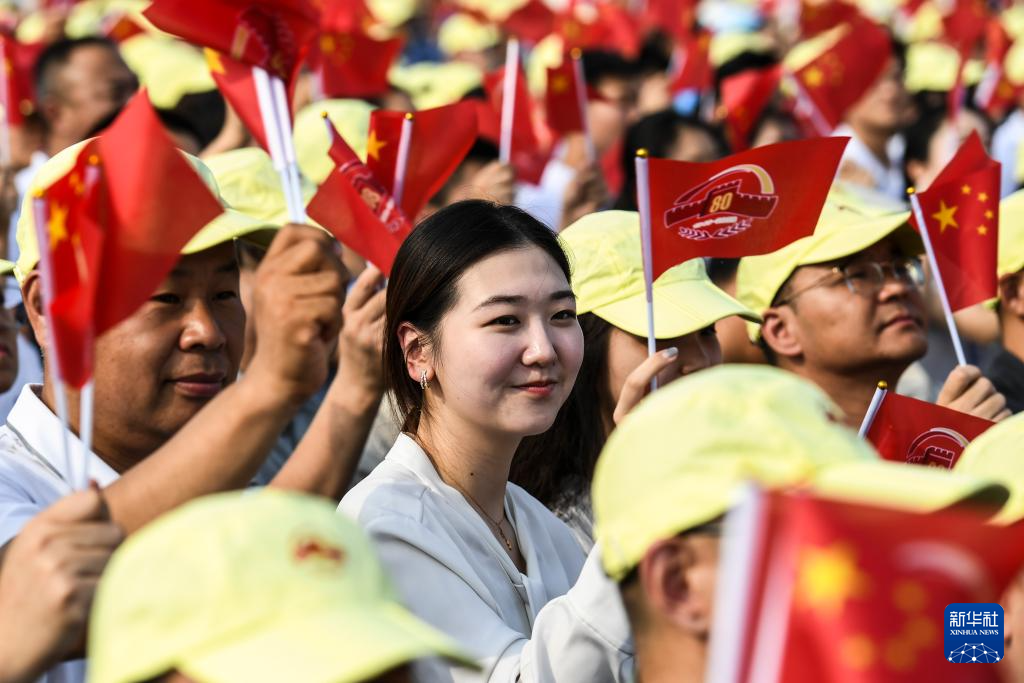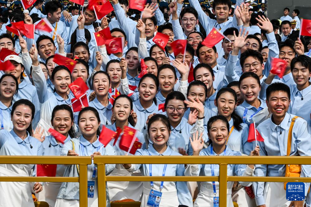 9月3日,纪念中国人民抗日战争暨世界反法西斯战争胜利80周年大会在北京隆重举行。这是观众挥舞手中的旗帜。