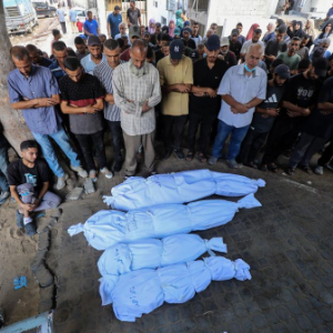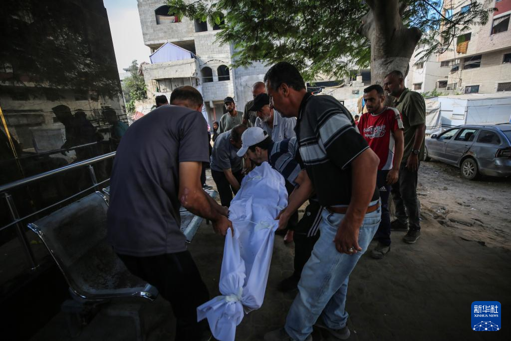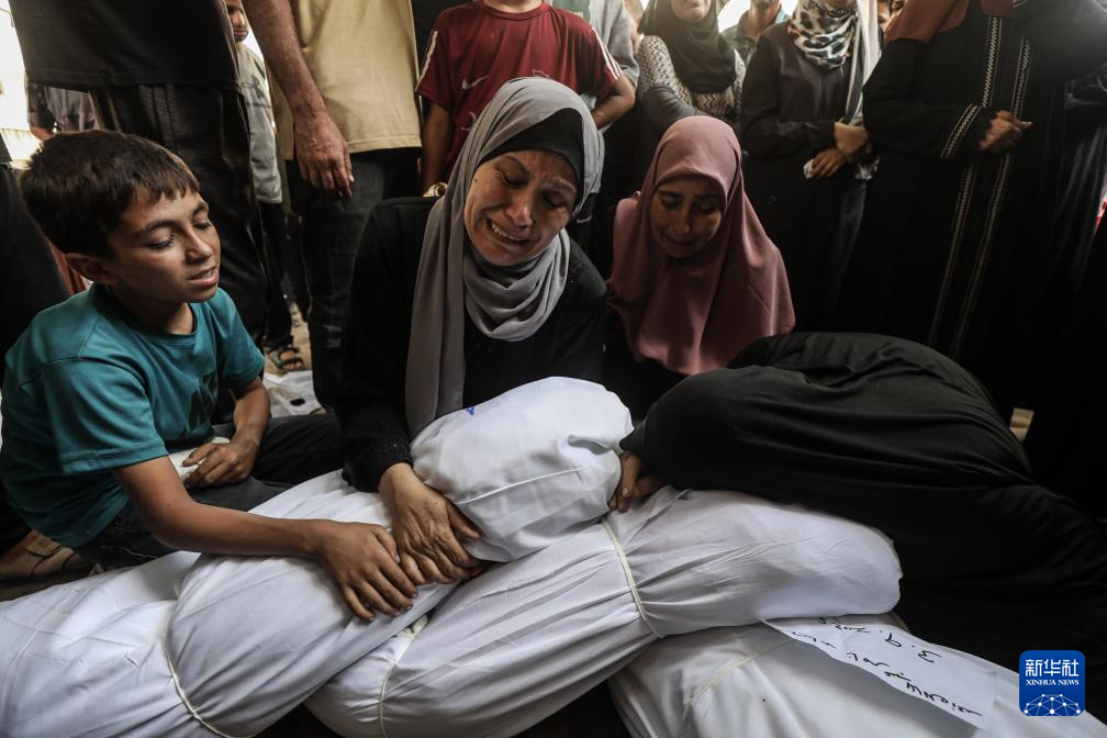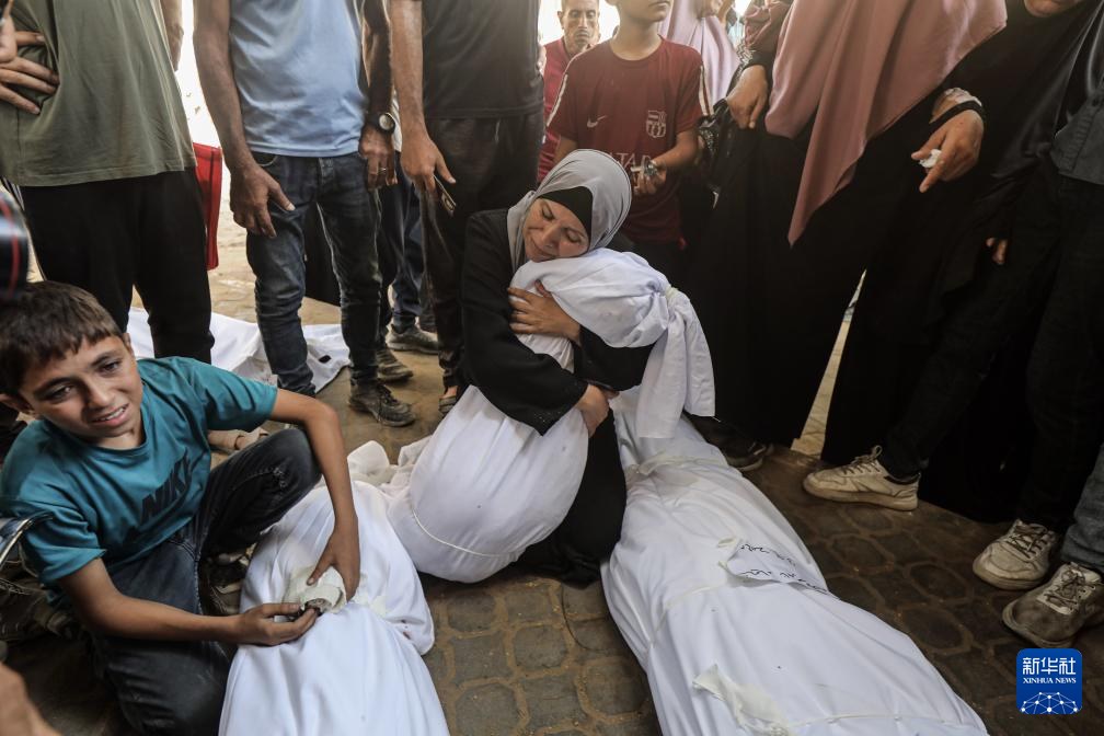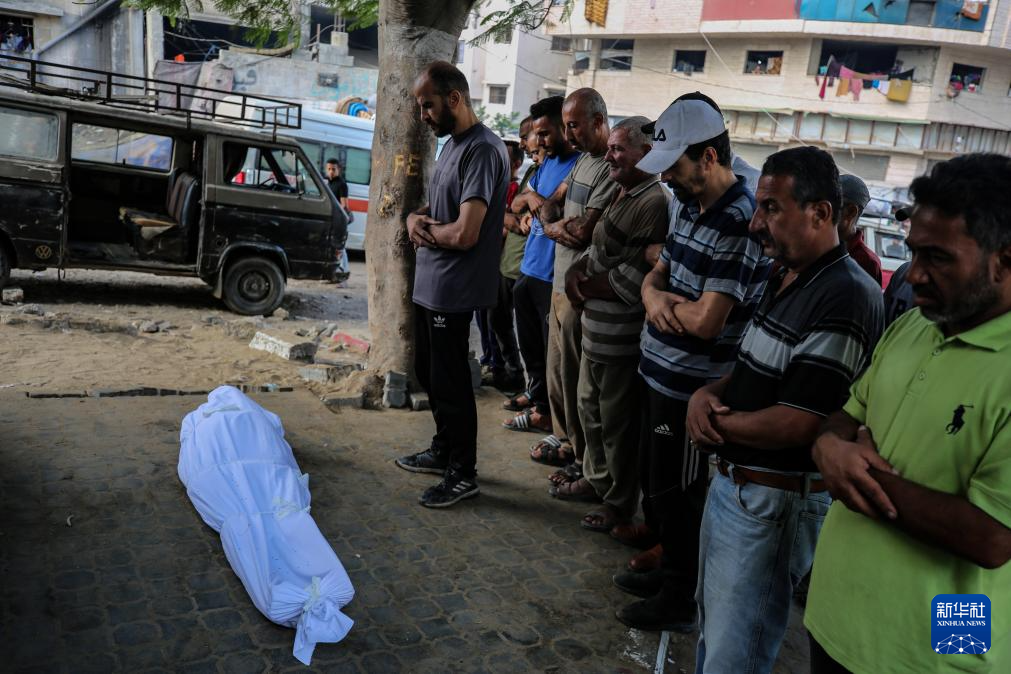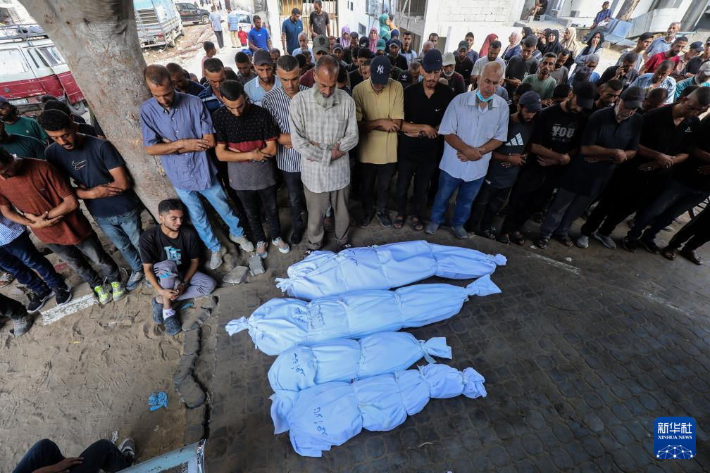9月3日,在加沙城的希法医院,巴勒斯坦人为在以军袭击中丧生的亲友送葬。