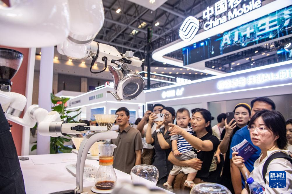 9月5日,中国移动展台的AI+智慧酒店机器人在为观众调制咖啡。