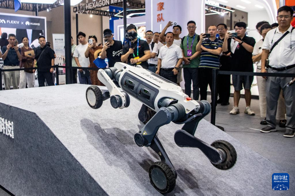 9月5日,云深处科技展台的“山猫M20”轮足机器狗在演示障碍翻越能力。