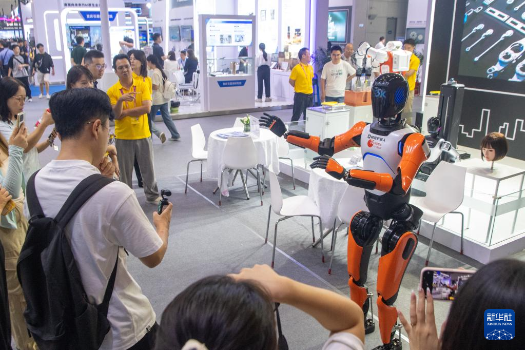 9月5日,智能机器人展区的“精金”机器人和观众互动。