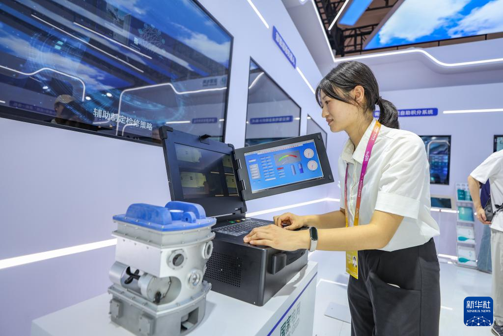9月5日,在2025世界智能产业博览会现场,国家电网展厅工作人员展示“大型变压器内部智能巡检机器鱼”。