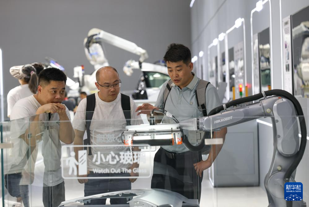 9月5日,观众在智博会现场参观汽车工业机器人。