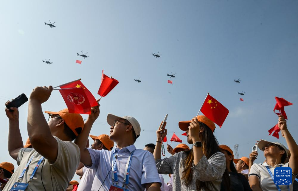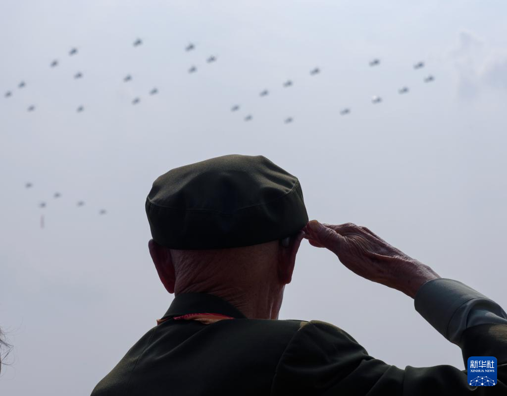 9月3日,纪念中国人民抗日战争暨世界反法西斯战争胜利80周年大会在北京隆重举行。这是观众拍摄空中护旗梯队通过天安门广场。