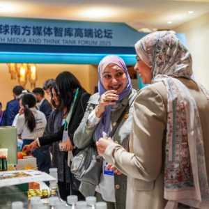 9月6日,出席2025全球南方媒体智库高端论坛的代表在开幕式会场接受媒体采访。