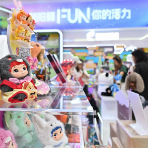 9月10日,观众在服贸会主题展区泡泡玛特展台前参观。