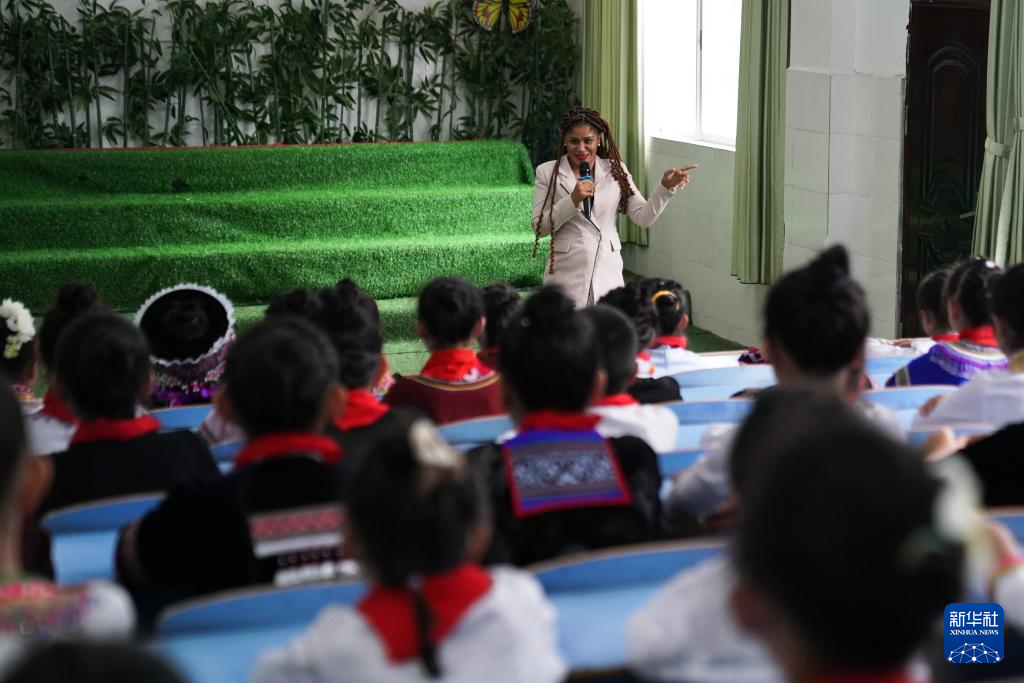 9月9日,米拉格罗萨·米查在中国-赤道几内亚友谊小学同孩子们交流。