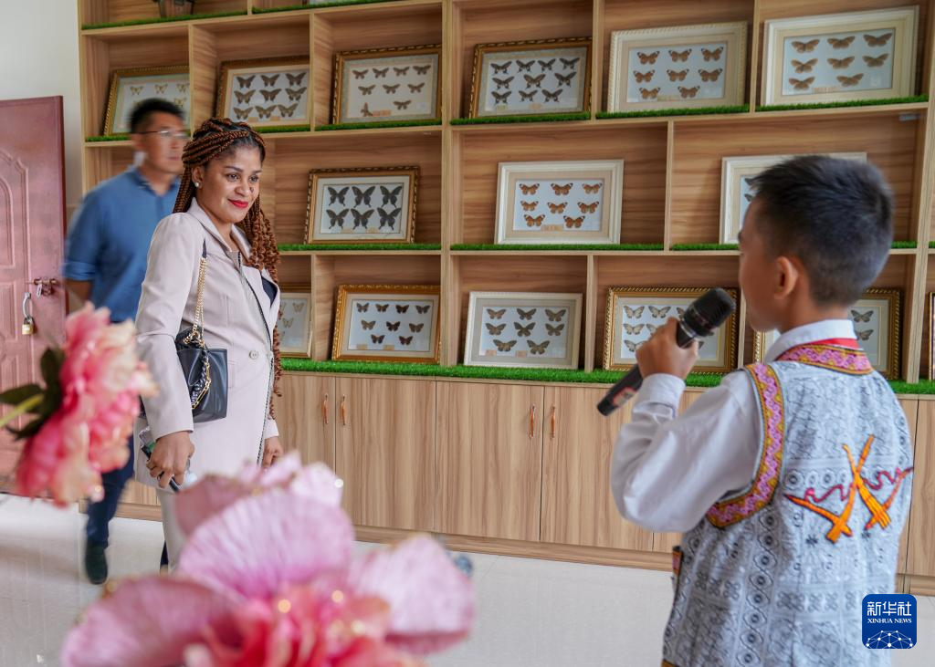 9月9日,中国-赤道几内亚友谊小学的学生为米拉格罗萨·米查介绍学校陈列的展品。