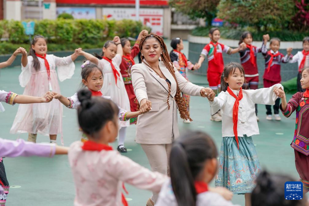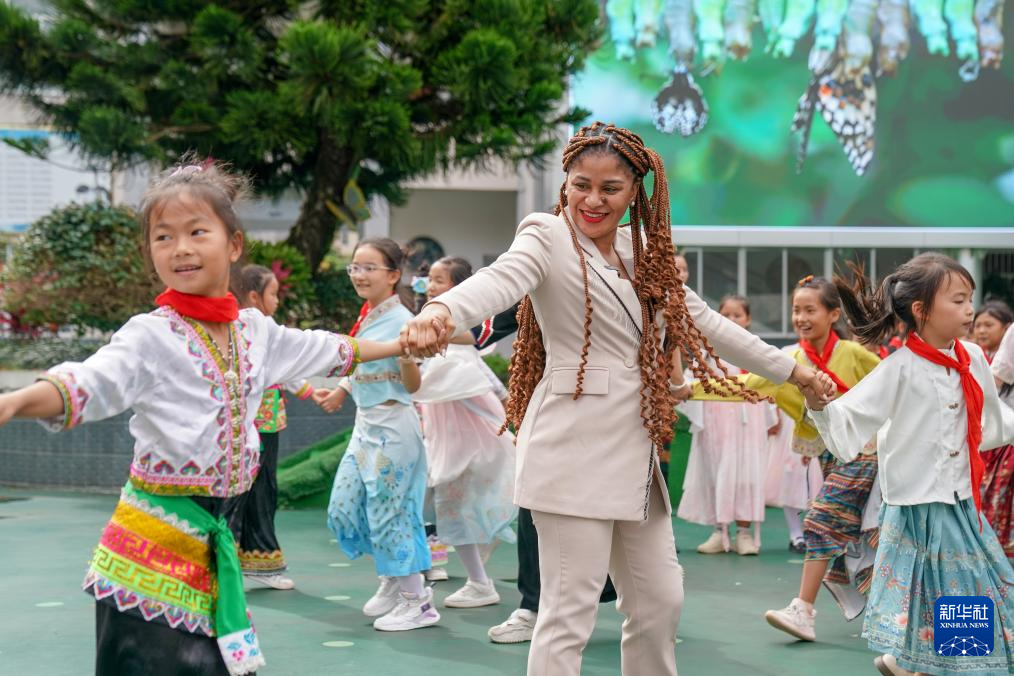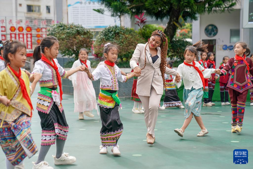 9月9日,米拉格罗萨·米查在中国-赤道几内亚友谊小学同孩子们一起舞蹈。