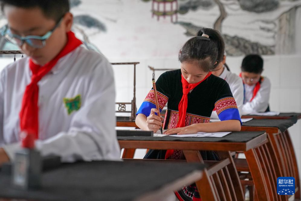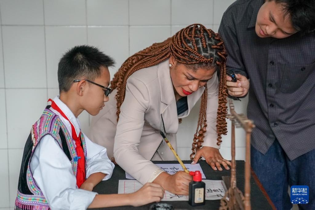 9月9日,米拉格罗萨·米查在中国-赤道几内亚友谊小学同孩子们交流书法。