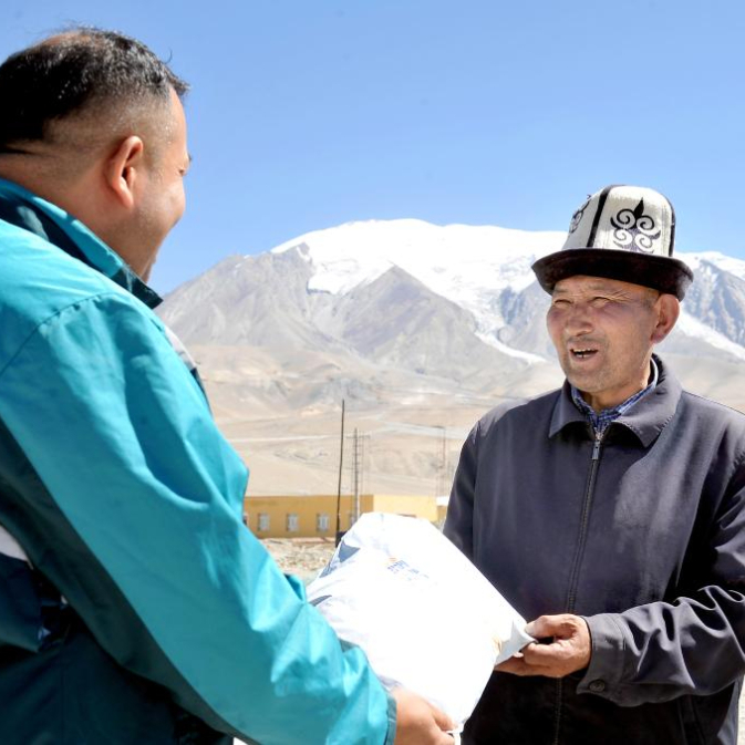 投递员阿克阿不都赛米·赛买提(左)把包裹送到新疆克孜勒苏柯尔克孜自治州阿克陶县布伦口乡布伦口村夏迪别克·排尔慢手中。邮路延伸到雪山脚下,让生活在边疆的各族民众也能享受到和城市居民一样快捷方便的邮政服务(9月9日摄)。