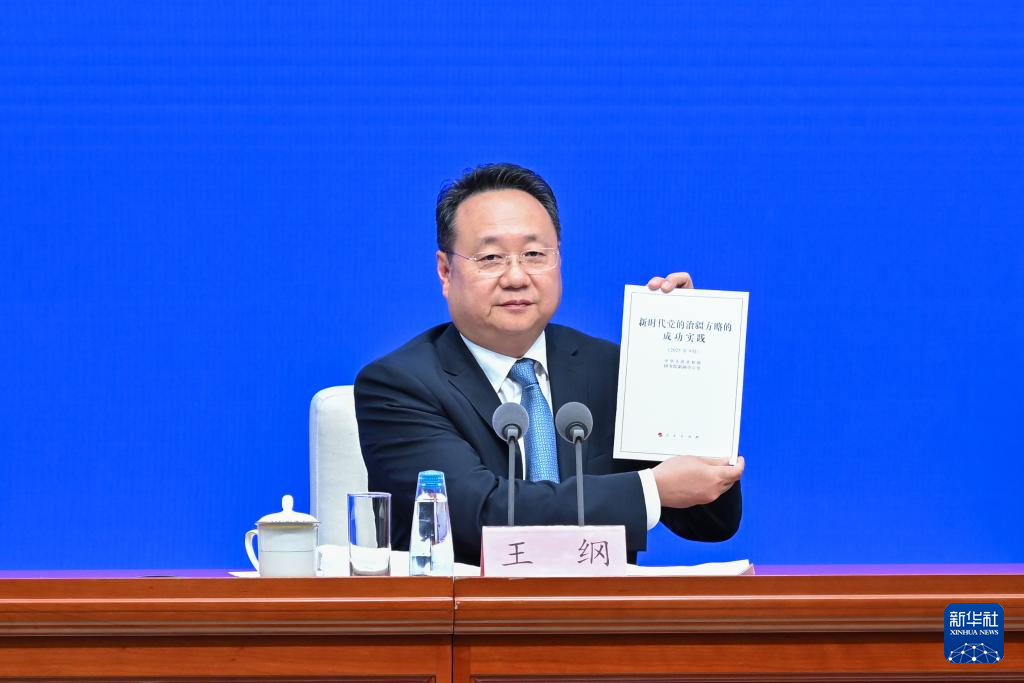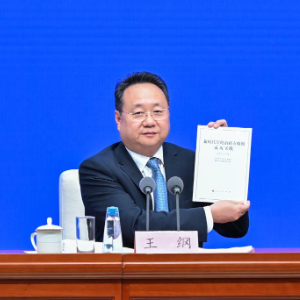 9月19日,国务院新闻办公室在北京举行新闻发布会,发布《新时代党的治疆方略的成功实践》白皮书,中央宣传部副部长王纲,新疆维吾尔自治区党委副书记、自治区主席艾尔肯·吐尼亚孜,新疆维吾尔自治区党委常委、自治区常务副主席陈伟俊,新疆维吾尔自治区党委常委、宣传部部长王建新出席,介绍白皮书有关情况并答记者问。这是王纲展示《新时代党的治疆方略的成功实践》白皮书。