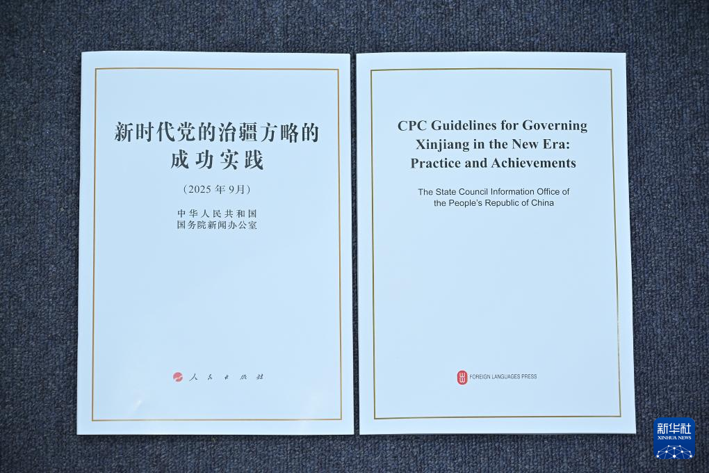 9月19日,国务院新闻办公室在北京举行新闻发布会,发布《新时代党的治疆方略的成功实践》白皮书,中央宣传部副部长王纲,新疆维吾尔自治区党委副书记、自治区主席艾尔肯·吐尼亚孜,新疆维吾尔自治区党委常委、自治区常务副主席陈伟俊,新疆维吾尔自治区党委常委、宣传部部长王建新出席,介绍白皮书有关情况并答记者问。这是《新时代党的治疆方略的成功实践》白皮书。