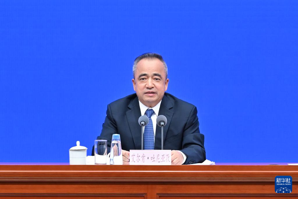 9月19日,国务院新闻办公室在北京举行新闻发布会,发布《新时代党的治疆方略的成功实践》白皮书,中央宣传部副部长王纲,新疆维吾尔自治区党委副书记、自治区主席艾尔肯·吐尼亚孜,新疆维吾尔自治区党委常委、自治区常务副主席陈伟俊,新疆维吾尔自治区党委常委、宣传部部长王建新出席,介绍白皮书有关情况并答记者问。这是艾尔肯·吐尼亚孜在介绍情况。
