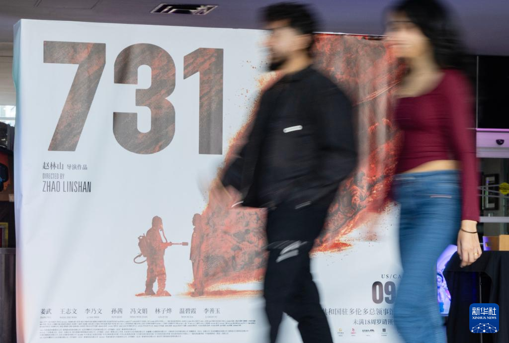 9月18日,在加拿大大多伦多地区,人们从电影《731》的海报前经过。