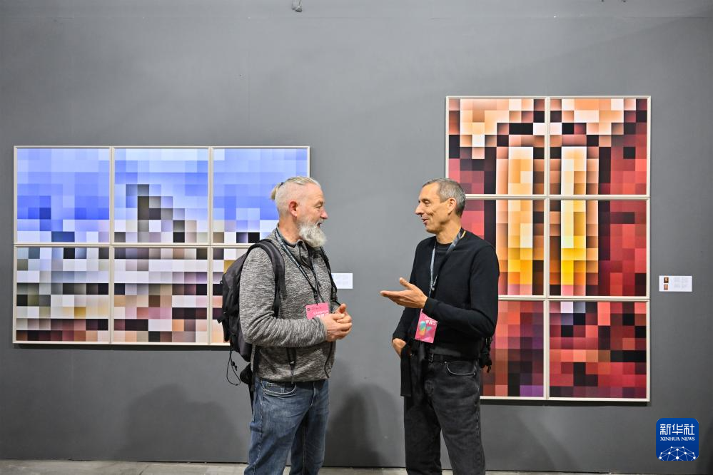 9月19日,两名参展摄影师在平遥国际摄影大展上交流。