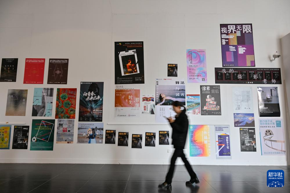 9月19日,参观者走过一面第25届平遥国际摄影大展相关海报组成的海报墙。