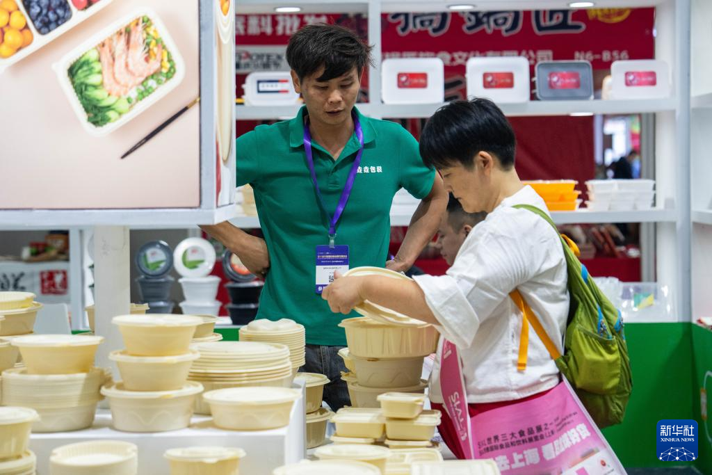 9月19日,在长沙国际会展中心,观众(右)在了解一次性饭盒。