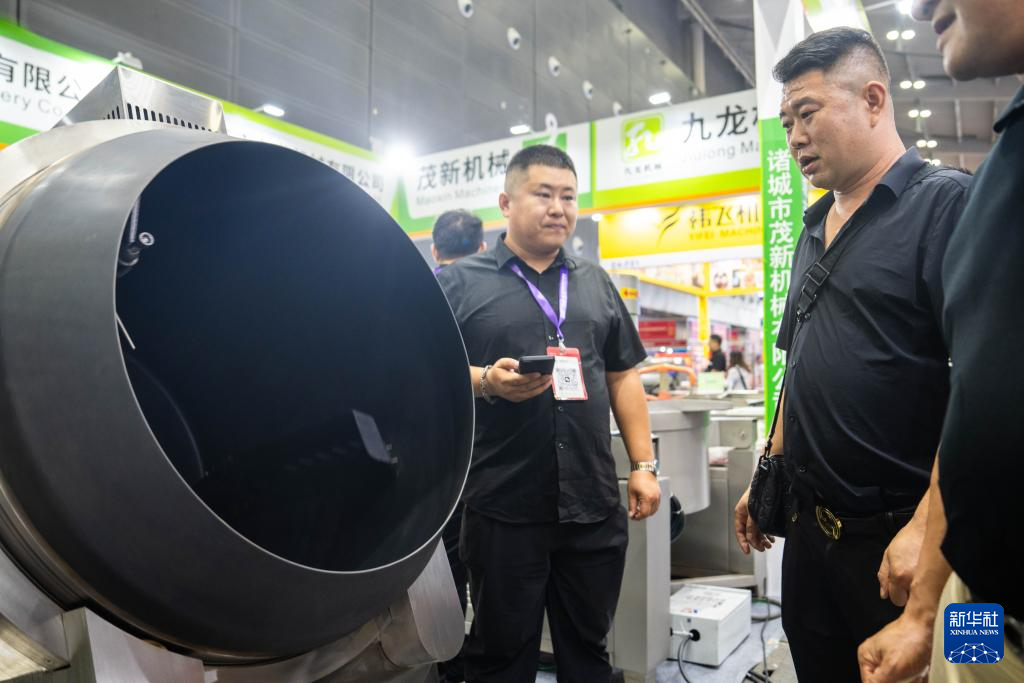 9月19日,在长沙国际会展中心,观众(右)在了解商用炒菜设备。