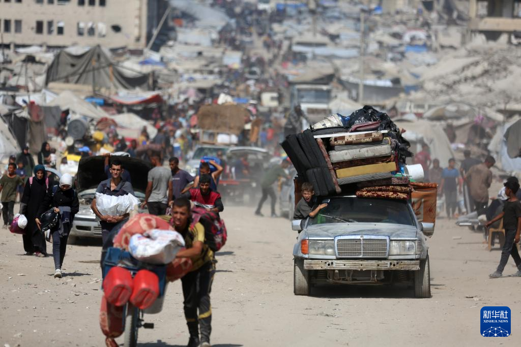 9月18日,在加沙城以西的沿海公路上,人们运载着生活用品,汇入人潮向南撤离。