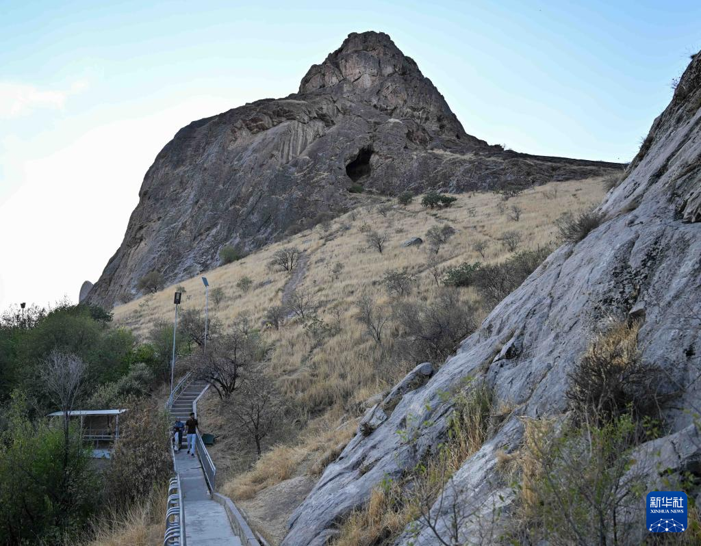 9月19日,在吉尔吉斯斯坦奥什,游客在苏莱曼山拍照。