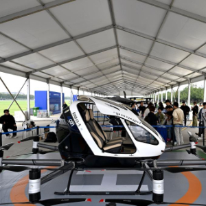 9月21日,观众在“全空间无人体系成果展”上体验一款无人驾驶飞行摩托。