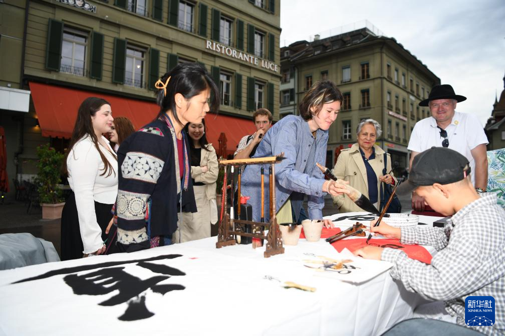 9月21日,在瑞士伯尔尼,人们在“你好!中国”文化和旅游推广活动中体验中国书法。