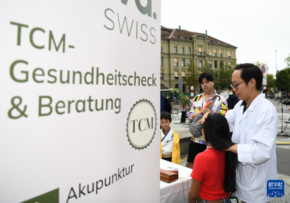 9月21日,在瑞士伯尔尼,人们在“你好!中国”文化和旅游推广活动中体验中式推拿。