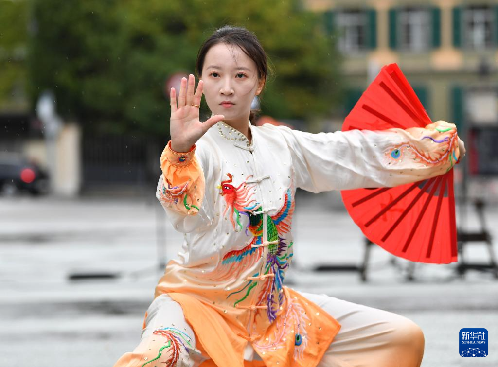 9月21日,在瑞士伯尔尼,一名女子在“你好!中国”文化和旅游推广活动中表演中国武术太极扇。