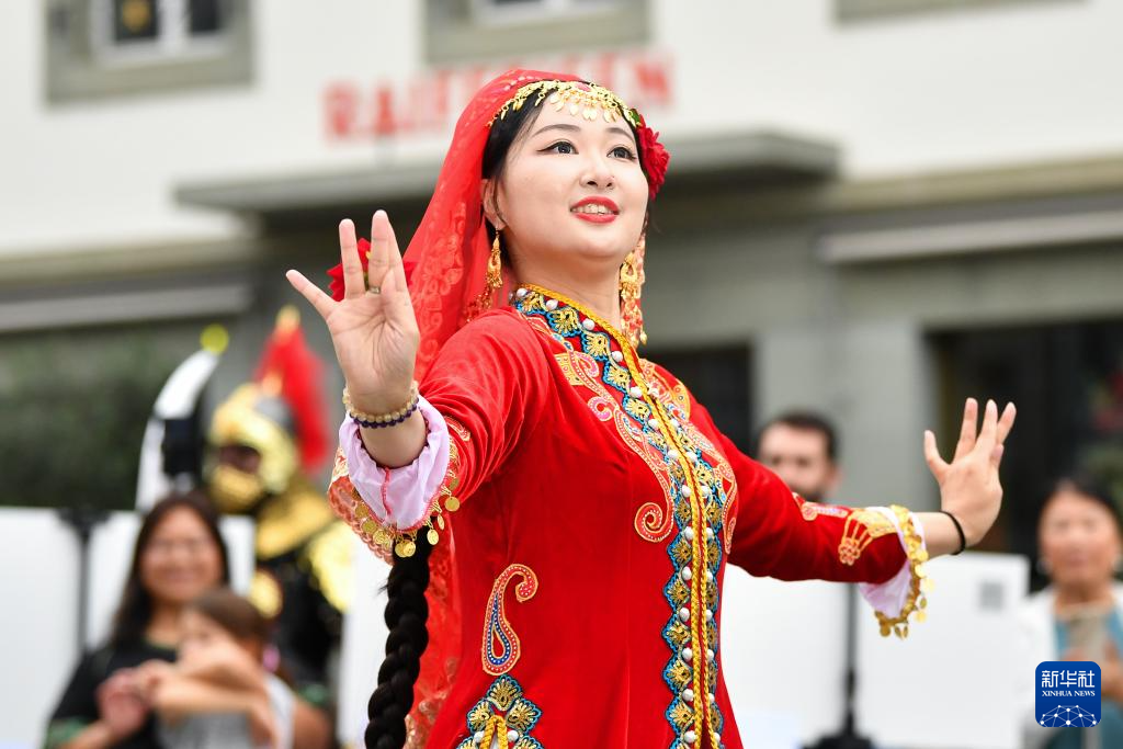 9月21日,在瑞士伯尔尼,一名女子在“你好!中国”文化和旅游推广活动中表演中国新疆舞。