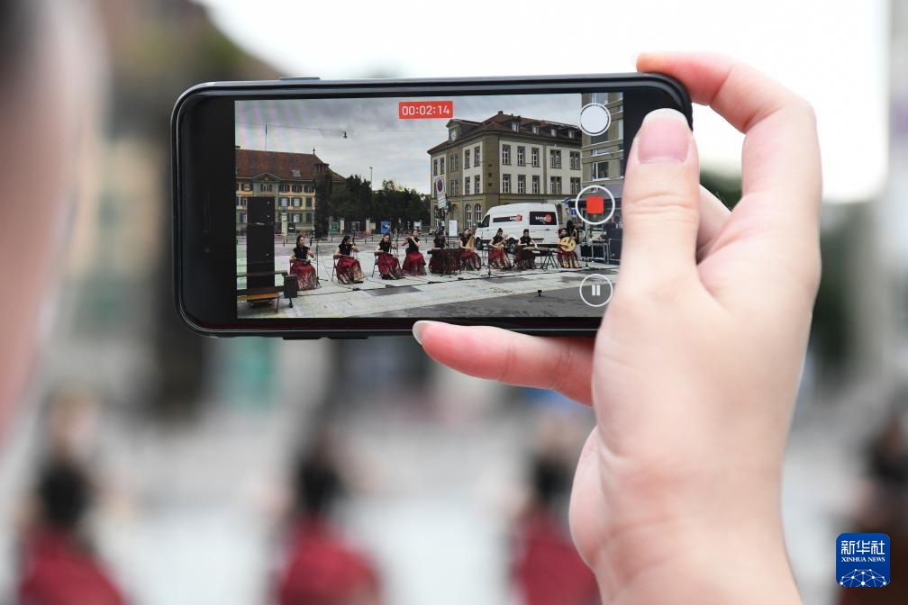 9月21日,在瑞士伯尔尼,一名观众在“你好!中国”文化和旅游推广活动中拍摄中国民乐表演。