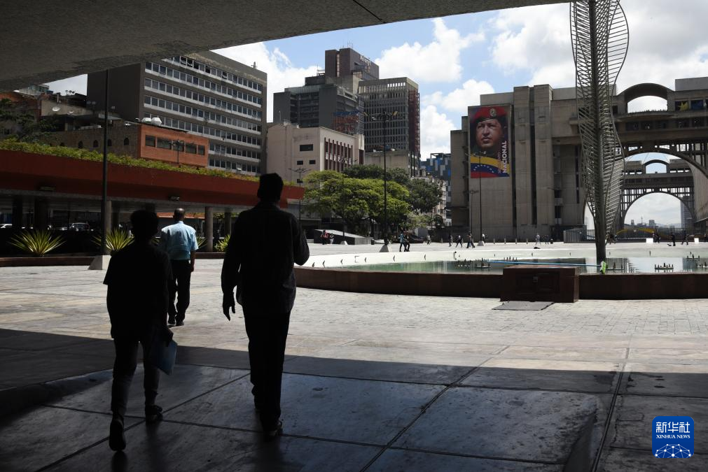 9月22日,在委内瑞拉首都加拉加斯,行人经过市中心的广场。广场上悬挂着已故总统查韦斯的大幅画像。