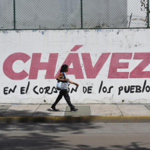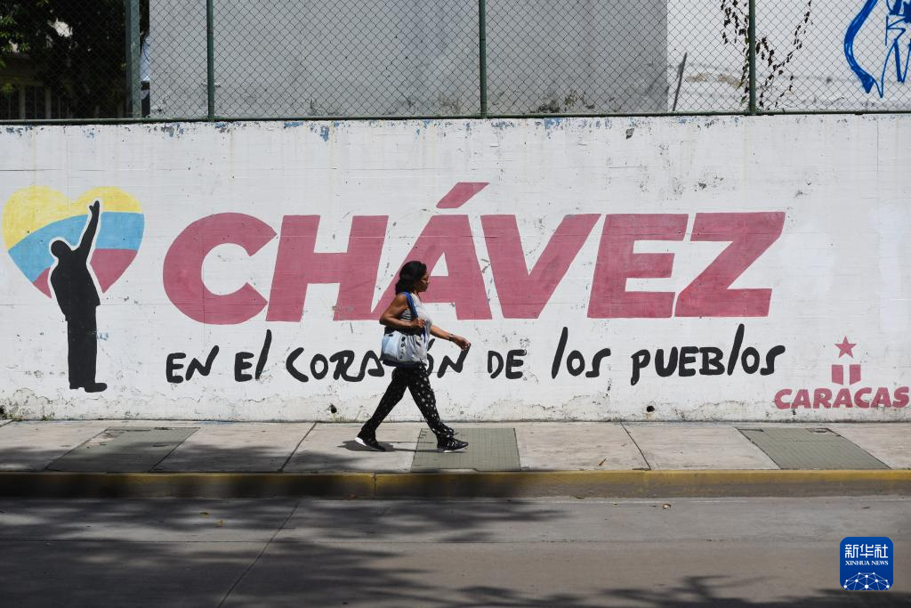 9月22日,在委内瑞拉首都加拉加斯,行人从街头支持已故总统查韦斯的宣传标语前走过。标语上写着“查韦斯在人民心中”。