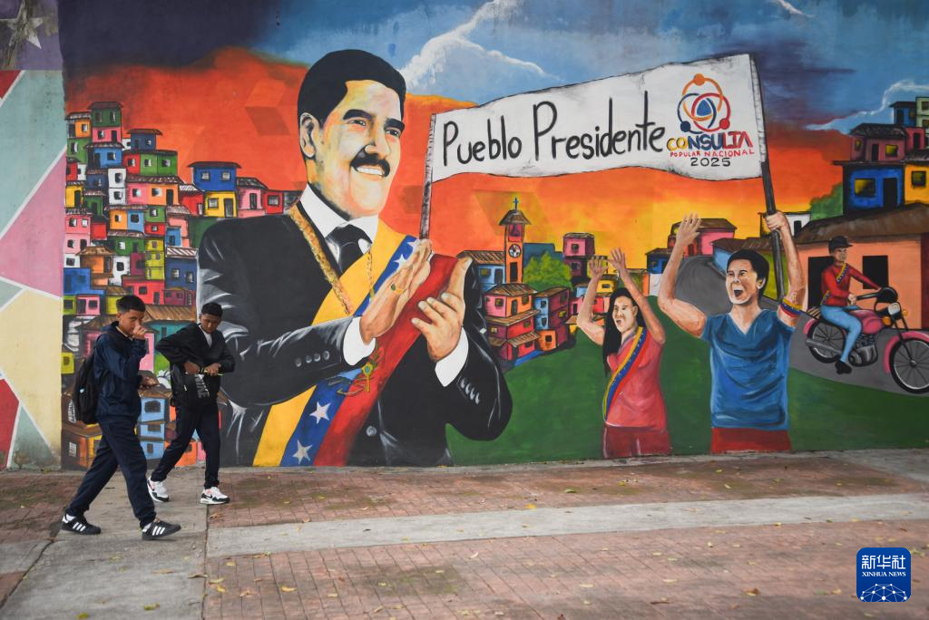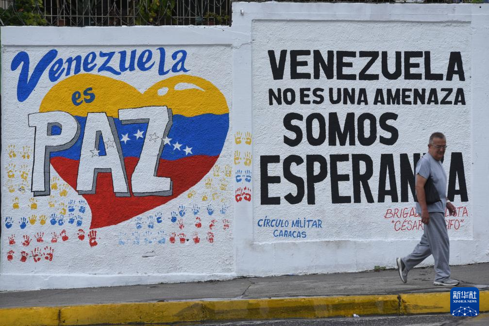 9月22日,在委内瑞拉首都加拉加斯,行人从街头的宣传标语前走过。标语上写着“委内瑞拉是和平国度”“委内瑞拉不是威胁,而是希望”。