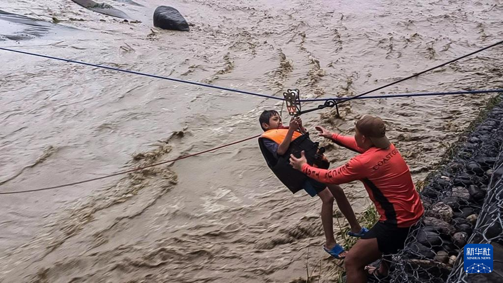 9月22日,在菲律宾南伊罗戈省,救援人员利用滑索帮助受灾居民撤离。