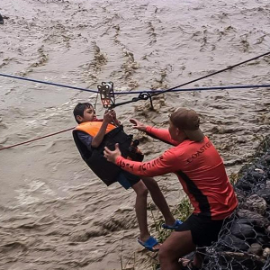 9月22日,在菲律宾南伊罗戈省,救援人员渡河搜救被困居民。