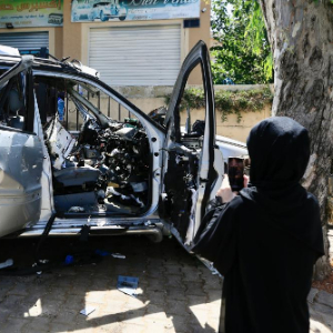这是9月22日在黎巴嫩南部城市宾特朱拜勒拍摄的一辆在以色列21日发动的空袭中被摧毁的汽车。