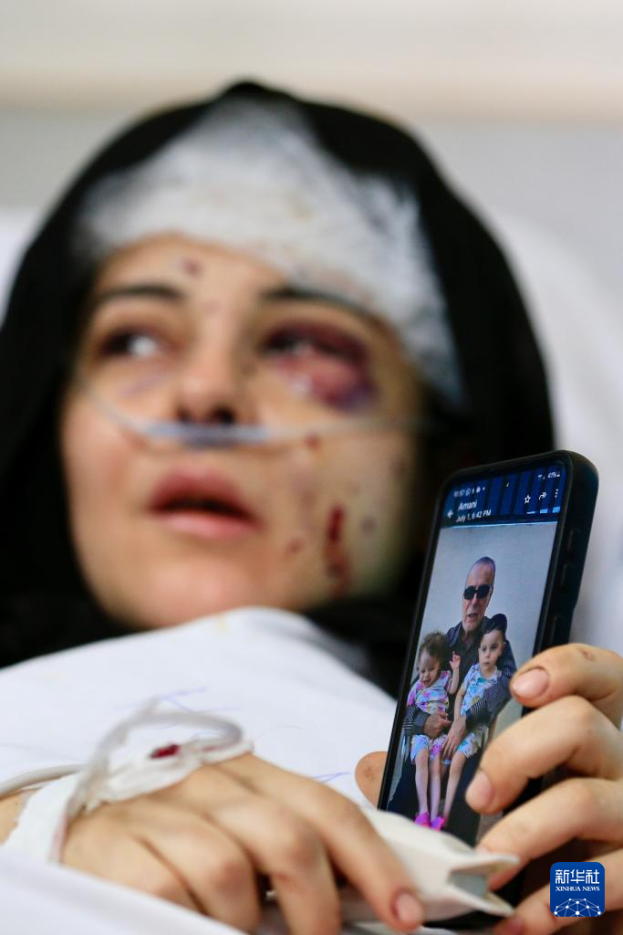 9月22日,在黎巴嫩南部的特布尼医院,受伤的阿马尼·巴齐在手机上展示在以色列21日发动的空袭中遇难的丈夫和孩子的照片。