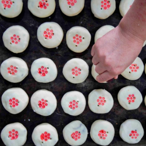 9月23日,在河北遵化市西三里镇一家糕点加工企业,工人在车间制作“喜”字红月饼。