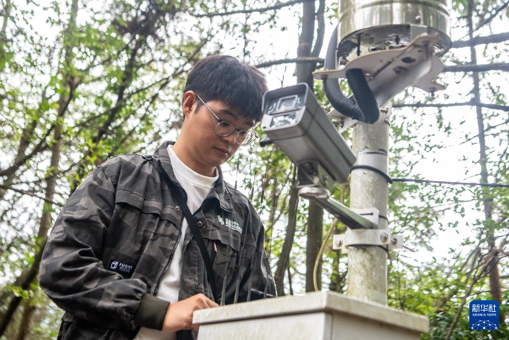 9月23日,在金佛山黑叶猴远程视频监控点,工作人员李新在检查观测设备。