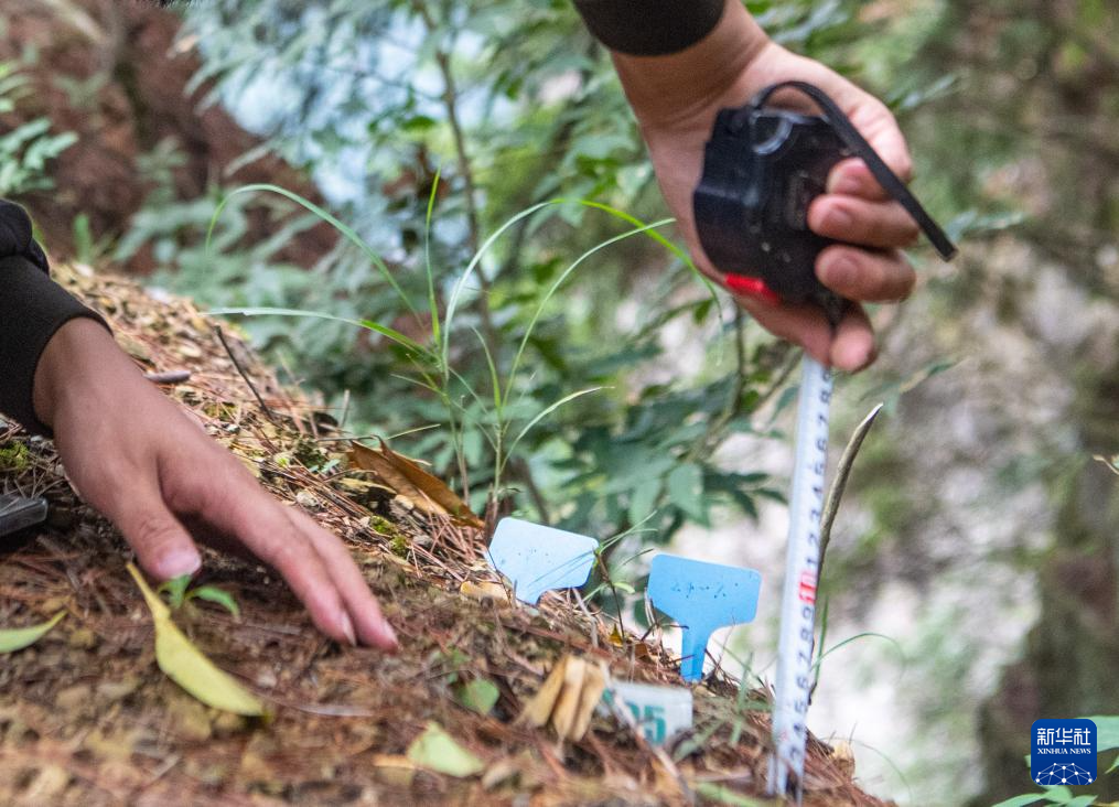 9月22日,在银杉幼苗野外回归地,李新(右)、王泳鳗在测量记录银杉幼苗生长情况。