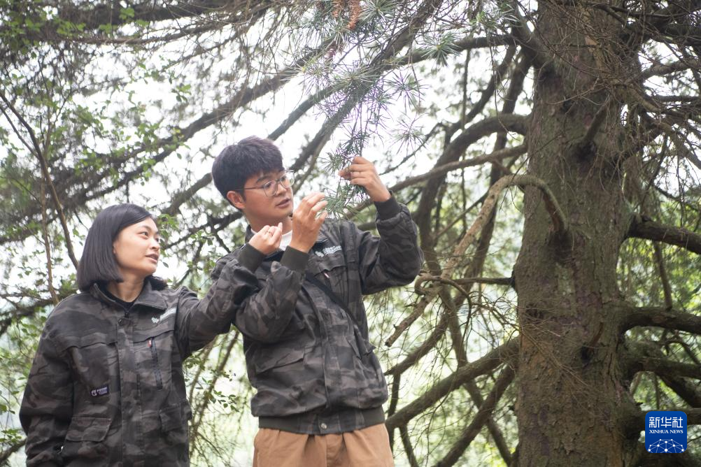 9月22日,在银杉群落监测样地,工作人员李新(右)、王泳鳗在查看001号银杉的健康状况。